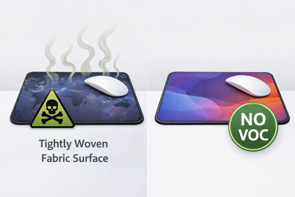 Chemical smells can also come from adhesives and inks used in printing. Low-end manufacturers might skimp on post-cure baking or washing of the material, leaving behind residual solvents that cause off-gassing. During production, cheaper glue or incomplete curing can leave a tacky, oily feel and a lingering VOC odor. By comparison, a factory with strict quality control will use certified low-VOC glues and thoroughly cure the pad, so it arrives odorless. Indoor air quality matters, especially for corporate or home office buyers; one guide notes that “low-VOC mouse mats” explicitly aim to reduce indoor pollution and be safer for chemical-sensitive users. In practice, the difference is clear: a cheap mouse pad may need airing-out for days (or weeks) before it stops smelling, while a high-grade pad can go straight to use with no irritating odor.