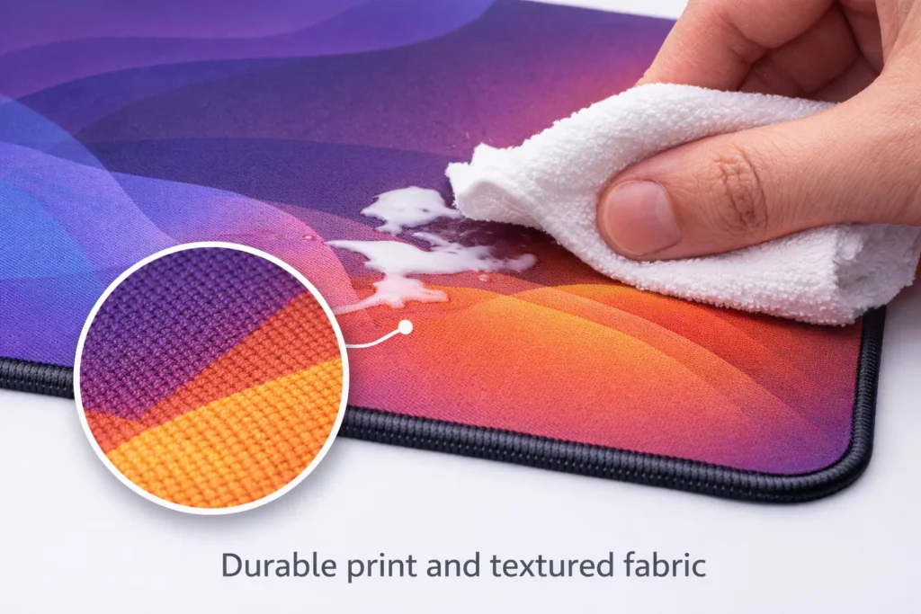 The printing process also matters. Quality pads often use dye-sublimation printing: heat transfers ink into the fabric fibers so the artwork is locked in for life. In contrast, cheap promotional pads might use heat-transfer decals or screen-print inks laid on top of the fabric. Initially, both methods can produce vivid graphics, but only sublimation embeds the color for true durability. Industry guides note that heat-transfer prints can fade or crack after cleaning or heavy use, whereas sublimated pads maintain vibrant designs even after years of wear. In practical terms, a low-cost pad’s logo might start flaking or fading within months, while a premium pad’s print stays sharp. One warning: “a factory uses cheaper heat transfer printing, which fades quickly,” is a common pitfall to watch for.