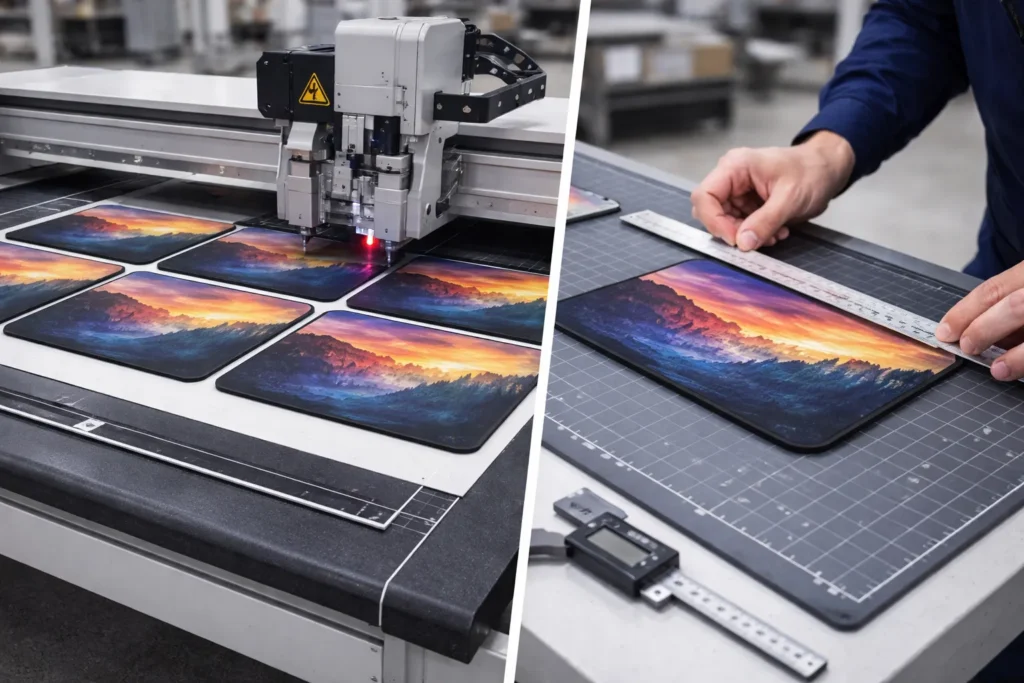 Cheap mouse pads can even vary in size or flatness, leading to hidden frustrations. Top-tier pad manufacturers invest in precise tooling and quality checks to ensure every unit matches spec. For instance, they use die-cutting or industrial laser cutters with sharp blades and then measure each pad. In practice, a high-volume factory might perform a 100% inspection for dimensions and flatness – catching any pads that are even a few millimeters off. In contrast, a budget operation may accept looser tolerances: orders for 300×250 mm pads might see some samples at 298×250 mm or with slightly rounded corners due to stretched fabric. Those few millimeters can matter for packaging or multi-pad setups.