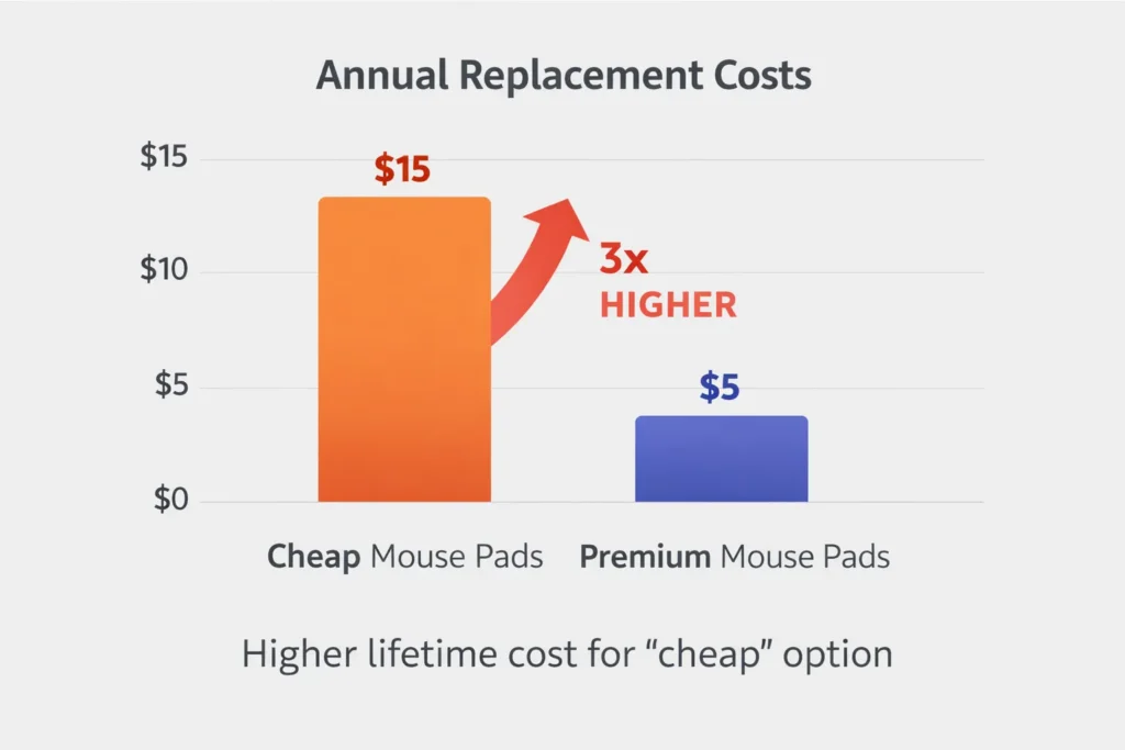 When calculating value, consider not just the unit cost but the lifetime of the pad. Cheap mouse pads often show wear within months: edges fray, surface fibers pill, and the base can compress or tear with heavy use. One analysis finds a $20 budget pad might need replacing every 6 months on average. That means a company spending $20 per pad twice a year pays ~$80 over two years. In contrast, a $50–$60 high-quality pad can easily last 2+ years with no decline in performance. Over the same period, the total cost is about $55 (for the one pad) versus $80 for repeats. Plus, premium pads spare you the hidden costs of downtime: employees or customers repeatedly complaining, cleaning old pads, or re-ordering stock.
