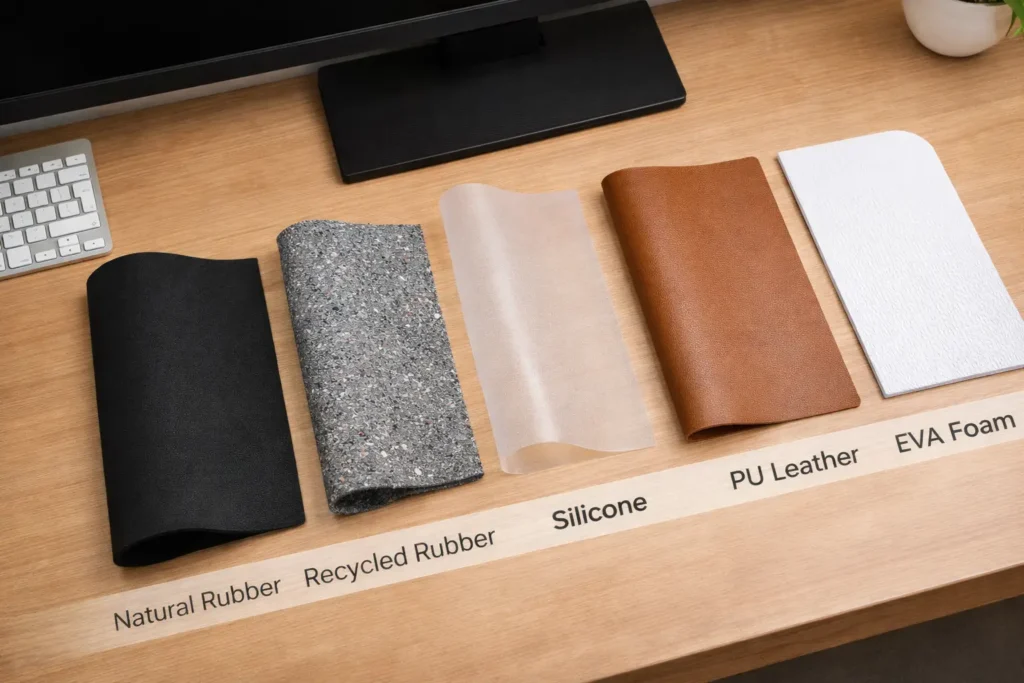 Choosing a mouse pad material should be more than an afterthought. Different base materials have distinct characteristics that affect smell, grip, longevity, and even brand perception. Below, we compare five popular materials for mouse pad bases: natural rubber, recycled rubber, silicone, PU leather, and EVA foam. Understanding these will help you match the material to your project’s needs.
