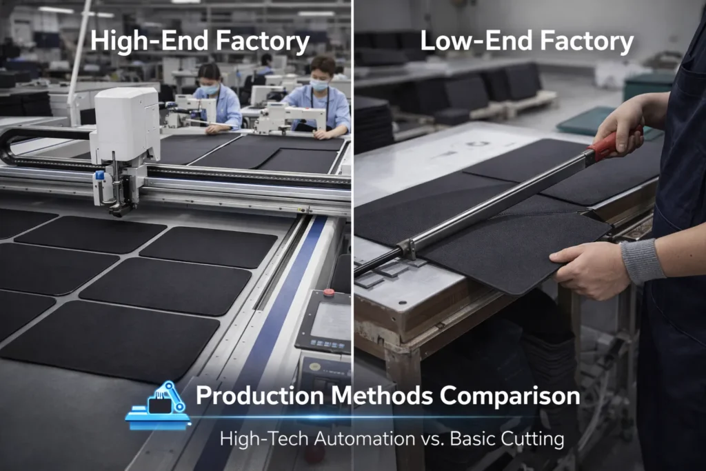 - Edge Finishing Process: If edges are stitched, the manufacturing technique is important. Quality factories use automated sewing machines set to the right stitch density (for example, 3–5 stitches per centimeter) and appropriate thread tension. This yields a neat, even stitch that doesn’t unravel. They also often heat-trim any excess threads. In contrast, a low-cost operation might hand-stitch or use cheaper thread that can loosen. If edges are not stitched, some factories will laser cut the edges for a sealed finish – but improper settings can scorch the fabric or leave a stiff edge. Edge processing is one area where factories differentiate themselves: laser cutting is fast and cheap (hence why some “cheap mouse pads” do only that), whereas stitching is slower and costlier but far more durable. Knowing how a supplier finishes edges can tell you a lot about their commitment to quality.