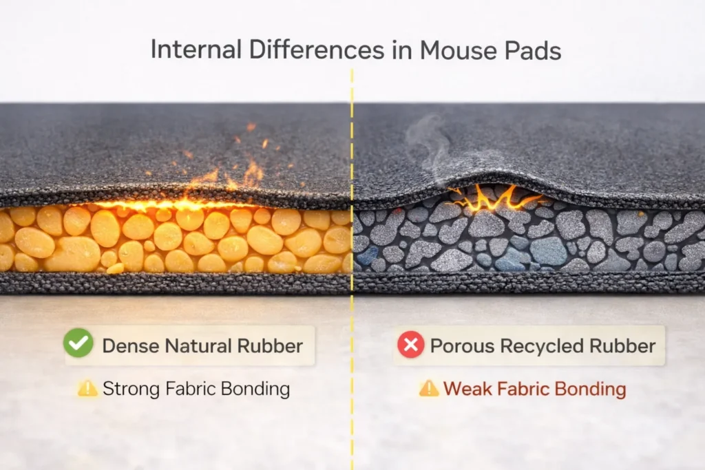 Natural vs. Recycled Rubber: High-quality mouse pads typically use natural foam rubber harvested from rubber trees. Natural rubber maintains elasticity and has a milder odor than synthetic or recycled blends. In contrast, some factories cut costs by using recycled rubber or inferior synthetic compounds. Recycled rubber (often made from ground-up scrap tires or industrial rubber waste) can look the same, but it smells strongly (like gasoline or burnt tires) and breaks down faster. A sourcing guide for importing mouse pads even cautions that the “trap is getting recycled rubber” because of its bad smell and short lifespan. So, if one pad gives off a pungent smell for weeks while another is nearly odorless, the difference is likely in the base material quality.