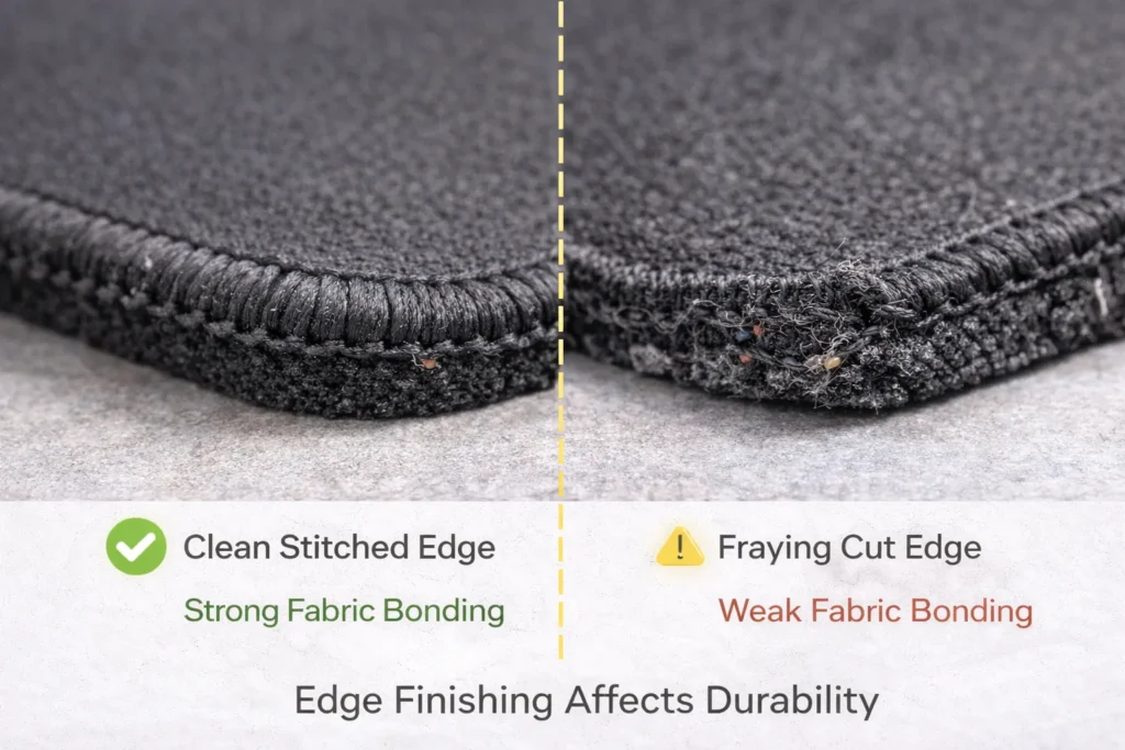 - Edge Finish and Construction: Edges might be laser-cut or heat-sealed on a cheaper pad, versus stitched with thread on a higher-end pad. They may look the same new, but laser-cut edges can fray or curl quickly. A stitched edge (often called lock-stitching) not only looks neater long-term but prevents the surface from separating and greatly improves durability.