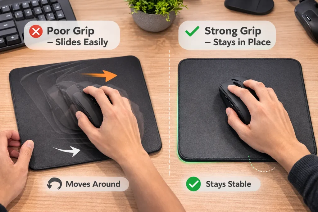 Grip Performance (Anti-Slip): Not all “non-slip” bases are equal. The quality of rubber and any anti-slip texturing on the bottom determine how much force or tilt is needed to make the pad slide. In our experience, a well-made natural rubber pad can cling so well that it stays put even when the desk is tilted at a 50° angle, whereas a cheaper pad might begin sliding around 20°–30° of tilt. In a simple drag test, a premium pad might require significantly more force (e.g. >5 N of pull) to budge on a smooth table, while a lower-grade pad moves with perhaps half that force. The difference is noticeable: end-users will complain if a mouse pad “dances” on the desk during intense use. Good manufacturers ensure a high-friction rubber compound and adequate surface contact area (some bases have micro-textured patterns to enhance grip). They also fully cure and wash the rubber to remove any slick residues and excess odor. The result is a pad that stays planted and doesn’t stink, right out of the packaging.