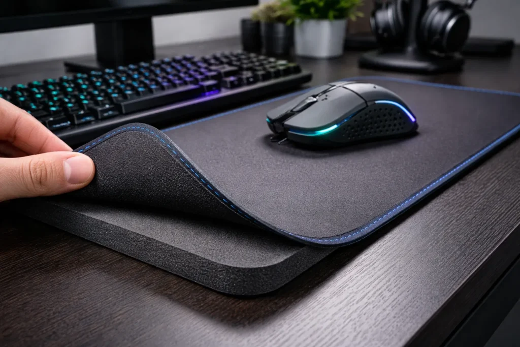 PORON’s soft foam provides a gentle “give” under the mouse, which can improve fine control by adding consistent resistance. When a mouse is lifted and placed back, PORON’s quick rebound ensures the pad almost instantly returns to flat, so tracking sensors aren’t fooled by lingering indentations. A well-engineered PORON pad strikes a balance of glide and grip: high-DPI optical and laser sensors glide smoothly on its microtextured surface, while PORON’s elastomeric response aids in micro-corrections. In practice, this means smoother flicks and more accurate cursor stopping—qualities demanded by esports pros. (Users often describe the feel as “controlled glide”.) As one factory expert notes, PORON achieves precision without sacrificing speed.