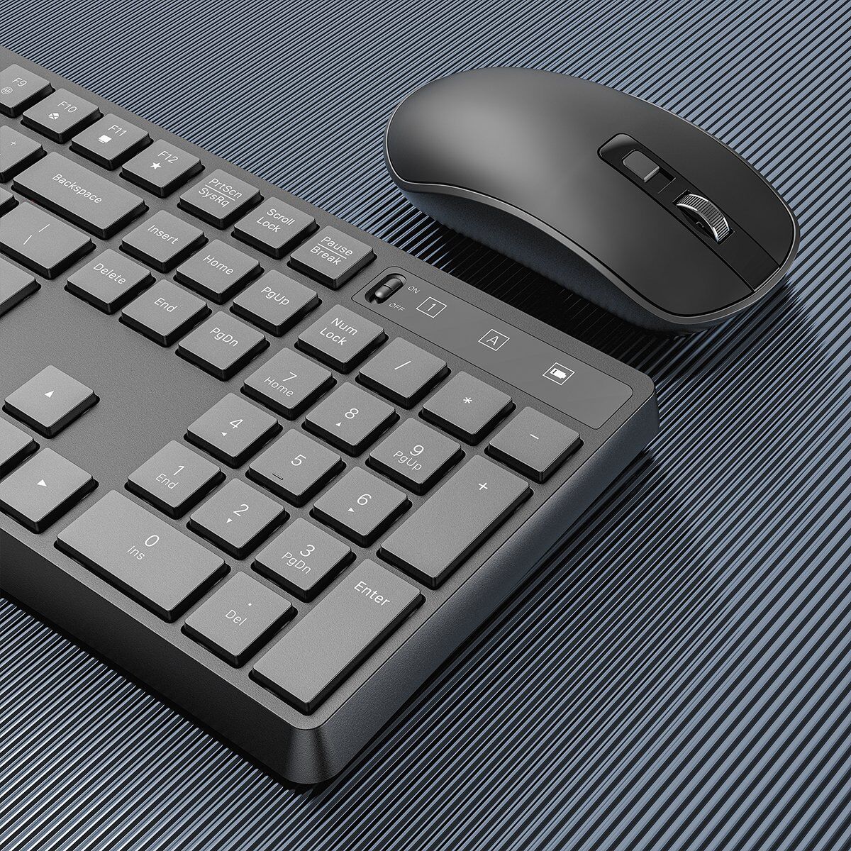 3.Power Saving Extends Battery Life– Keyboard and mouse wireless have power switch to turn on/off, saving unnecessary battery loss. After 10 minutes of inactivity, the wireless keyboard mouse combo will automatically go into sleep mode to save energy.The keyboard requires one AAA battery, and the mouse requires two.