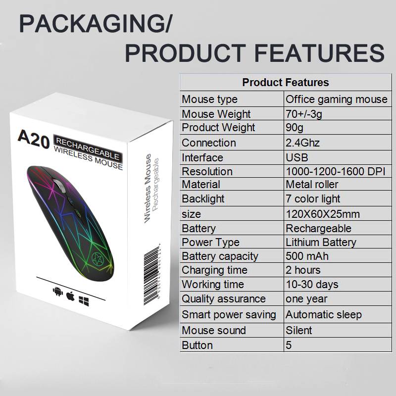 A20 Rechargeable Lithium Battery Colorful 2.4Ghz Optical Gaming Wireless Mouse