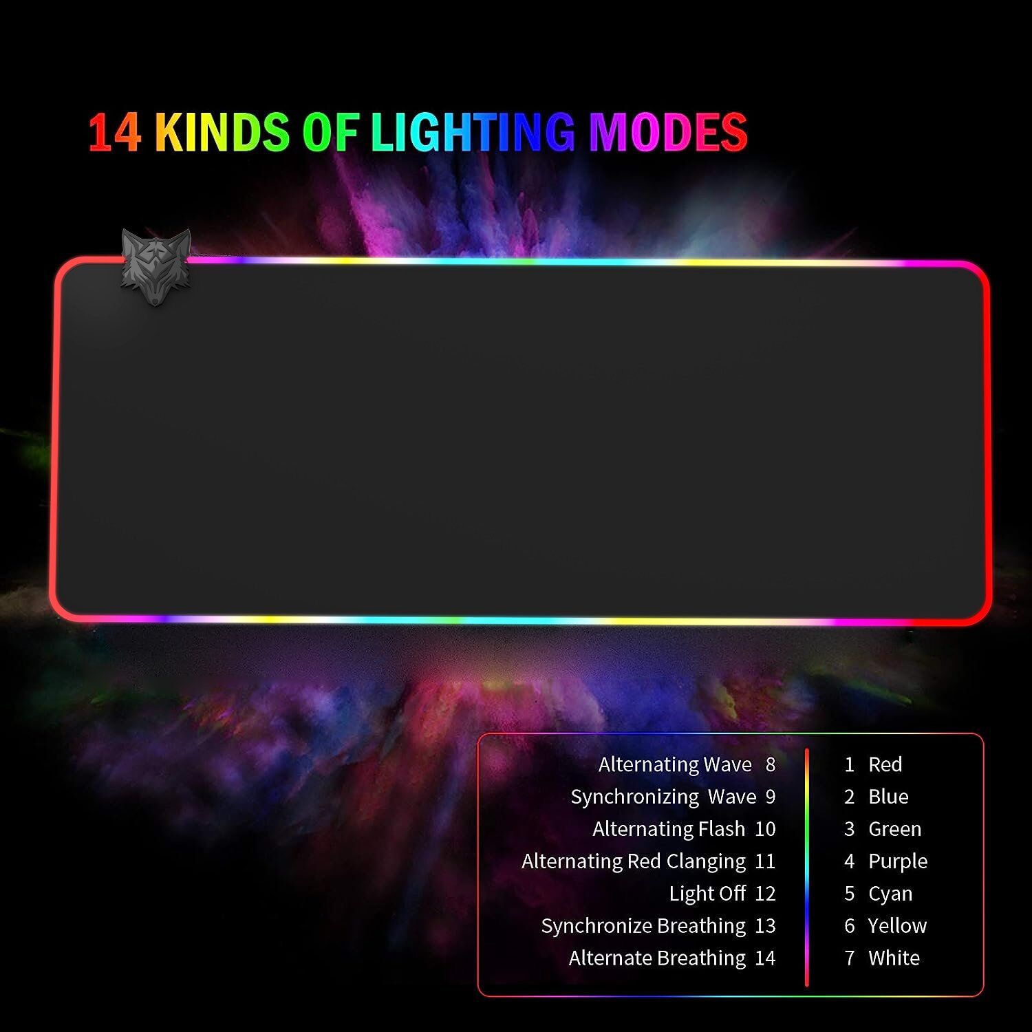 7 Solid Colors, 14 Modes: Blue, Red, Green, White, Purple, Cyan, Yellow Breathing Mode, Running Horse Mode