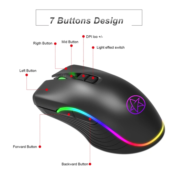 8:Количество клавиш: 7 клавиш(4 кнопки и 1 колесо (средняя кнопка) и dpi+/- (регулируемый) )