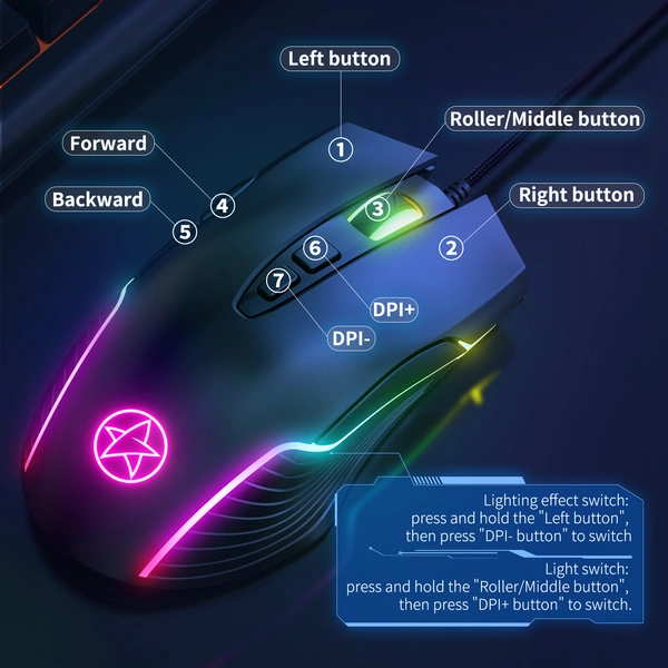 3.Оптическая игровая мышь: Левый/Правый/Средний/Передний/Задний/DPI .