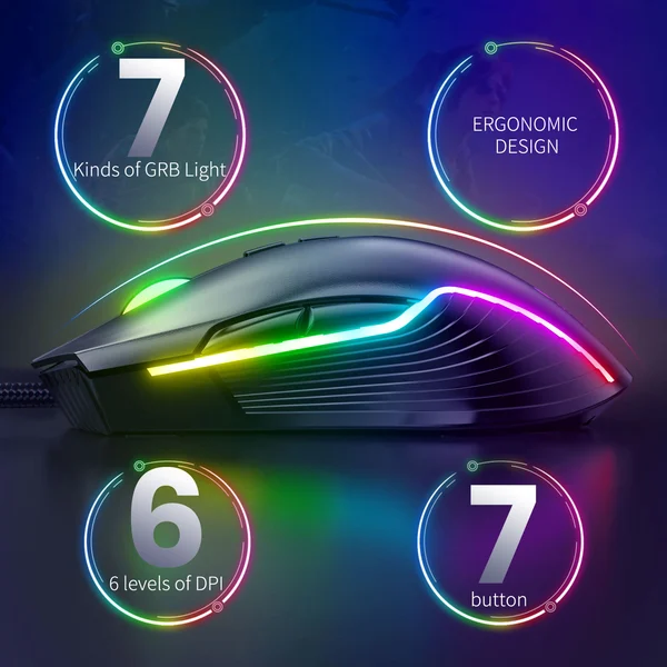 2.RGB Light: 6 одноцветных дышащих ламп, каждый цвет представляет различные DPI. 800 DPI зеленый свет дыхания, 1600 розовый, 2400 голубой, 3200 красный, 4800 голубой, 6400 желтый.