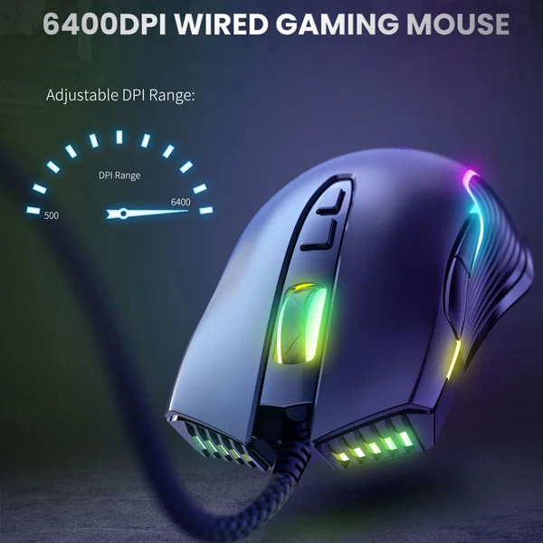 1.Регулируемая скорость DPI: 6 скоростей регулировки DPI, до 6400 DPI.