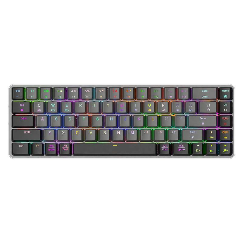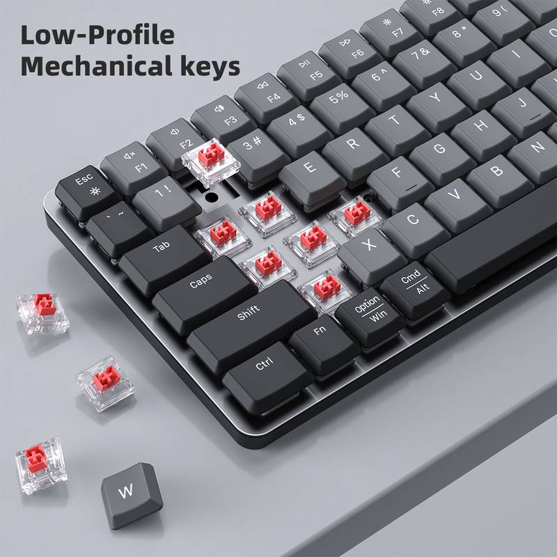 Kablosuz mekanik klavye, düşük profilli tuşlara ve mekanik kırmızı anahtarlara sahiptir, bu da onu duyarlı ve daha az gürültülü hale getirir, ofis veya iş kullanımı için idealdir.