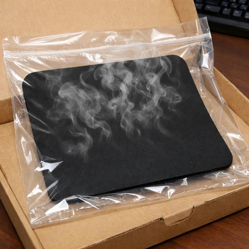 - Trapped Odors in Packaging: How the product is packaged plays a big role in odor intensity upon unboxing. Budget mouse pads are often shrink-wrapped or sealed in plastic immediately after production. That means all the VOC fumes that should be airing out are instead accumulating in the package. When you tear open that plastic wrap, you get a concentrated blast of weeks (or months) of pent-up chemical gas. High-end pads sometimes come in ventilated cardboard boxes or with a small vent hole in the bag to allow some off-gassing. Many cheap ones do not. The result is that the first thing you smell is essentially a VOC cloud escaping the bag. (Ever notice how a pad smells strongest right after opening, then slowly lessens? That’s the trapped VOCs finally dissipating into the room.)