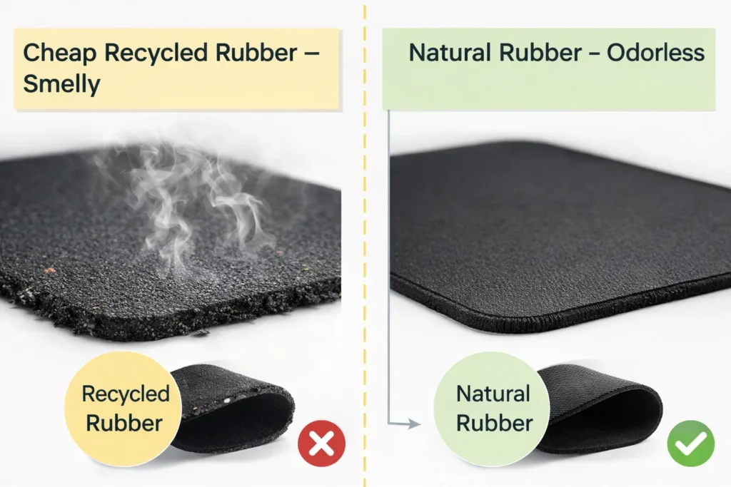 - Low-Grade Rubber Materials: Most cheap mouse pads use a rubber backing for grip. Often this is Styrene-Butadiene Rubber (SBR) or even recycled tire rubber, chosen for its low cost. These materials tend to contain impurities and additives that give off a pungent smell. Recycled rubber (from old tires or scraps) is especially notorious – it may still carry petroleum byproducts, sulfur compounds, or other chemicals from its past life. While recycling is eco-friendly in principle, low-quality recycled rubber can smell far worse than fresh natural rubber if not processed properly (many users report that pads made with recycled tire rubber smell stronger for longer than those made with new rubber). High-grade natural rubber, by contrast, has a milder, more “organic” odor. In short, cheaper rubber = stronger stench.