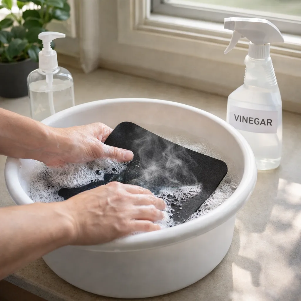 - White Vinegar Soak: White vinegar is a known odor neutralizer. Mix equal parts white vinegar and water (for example, 1 cup vinegar + 1 cup water) in a basin. Place the mouse pad in this solution, ensuring the rubber part especially is in contact with the vinegar-water. Let it soak for an hour or two. Vinegar’s acetic acid can help break down odor-causing compounds. After soaking, rinse the pad with water and a bit of mild soap to remove the vinegar scent. Many have found this effective – one tip on Amazon recommended a vinegar soak followed by towel-drying to get rid of “new pad smell.” It’s a quick and inexpensive remedy.